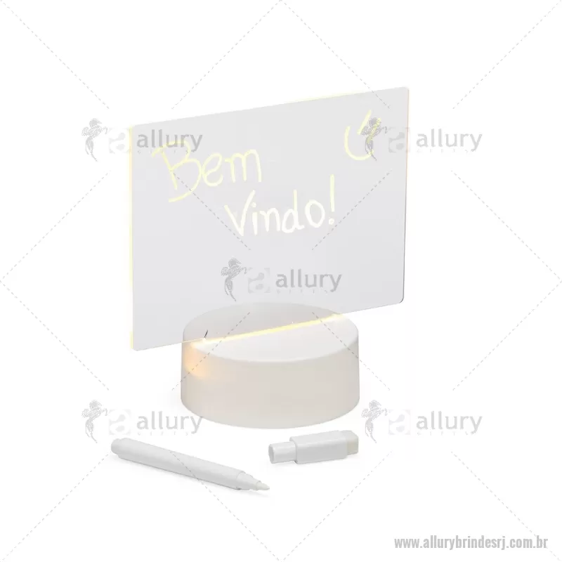 Luminária de Mesa Led Deixe qualquer espaço mais aconchegante e repleto de recadinhos incríveis com a nossa luminária. Com sua tela acrílica 3D, é possível soltar a criatividade e deixar mensagens inspiradoras, lembretes importantes ou até desenhos fofos, tudo de um jeito prático e super divertido! Com um funcionamento super simples, ela se conecta com cabo via USB integrado à base plástica ou por meio de 3 pilhas AAA (1.5V) não inclusas. Além disso, acompanha uma caneta plástica com apagador integrado, tornando a experiência ainda mais interativa e funcional. Essa luminária é perfeita para iluminar o ambiente e deixar recadinhos incríveis do seu jeito! Altura : 15,3 cm x Largura : 15 cm x Profundidade : 8,6 cm Tamanho total aproximado (CxL): Caneta: 11,2 cm x 1,2 cm Peso aproximado (g): 128 - - ALLRJLL031